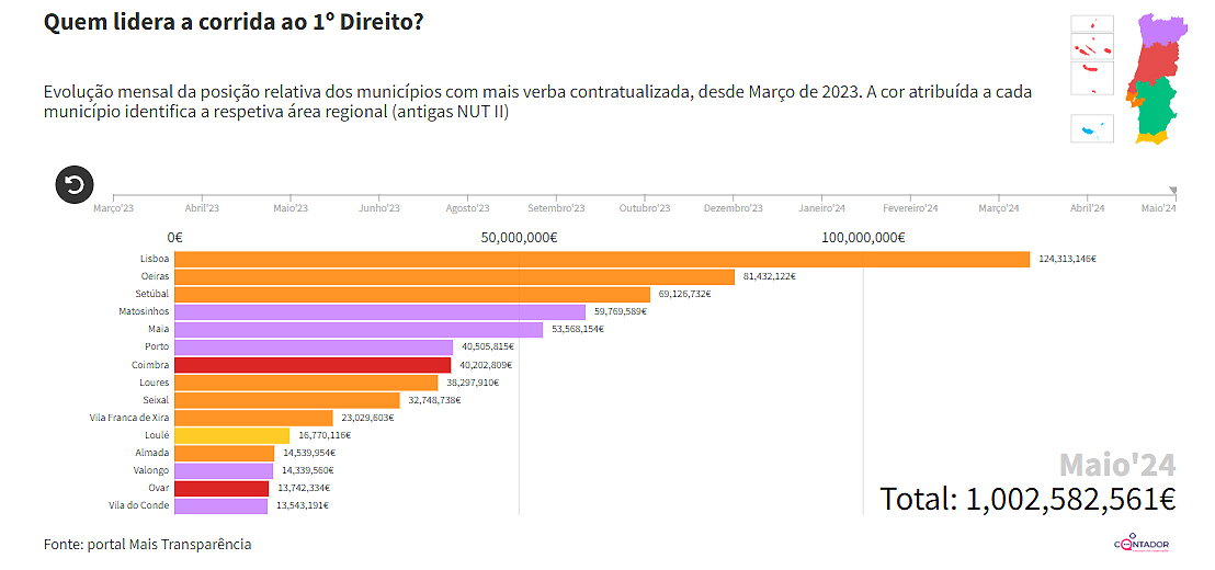 No que respeita ao programa 1.º Direito, por exemplo, a equipa analisa “a corrida dos municípios ao financiamento” desde Março de 2023 até agora e constata que “existem enormes diferenças entre os municípios e, ao nível do território, que tendencialmente as verbas se concentram em apenas duas regiões (Área Metropolitana de Lisboa e Região Norte)”.