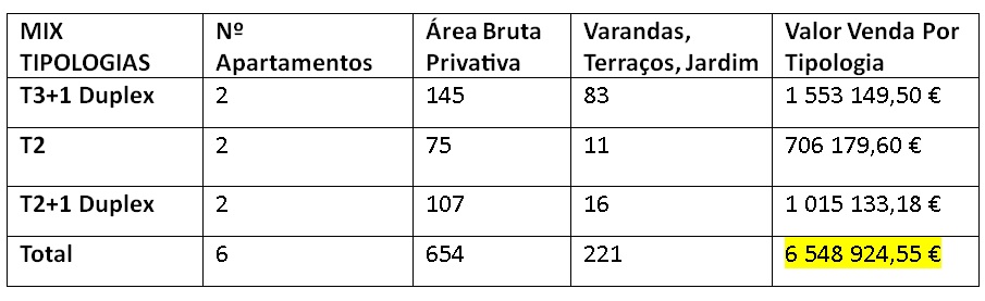 Assumindo um próposito de venda das frações, se considerarmos 9 000€/m2 como o preço médio de saída atendendo às características do Imóvel e tipo de reabilitação a desenvolver, o Volume Global de Vendas poderá atingir os 6 548 924,55€.