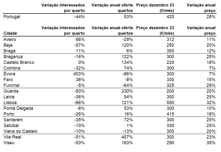 Analisando as capitais de distrito, a oferta subiu em quase todas as cidades, com exceção de Évora (-66%), Funchal (-64%), Aveiro (-29%), Viana do Castelo (-13%) e Faro (-8%), onde há menos quartos disponíveis para arrendar no mercado. Por outro lado, a oferta disparou em Vila Real (457%), Guarda (230%), Viseu (163%), Castelo Branco (134%), Bragança (122%), Lisboa (121%), Beja (120%), Coimbra (74%), Santarém (72%), Leiria (54%), Ponta Delgada (53%), Porto (16%), Braga (6%) e Setúbal (1%).
