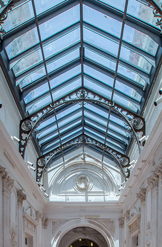 O layout do Palácio “está organizado em torno de uma galeria em forma de cruz latina, com um telhado envidraçado e uma estrutura de ferro fundido”.