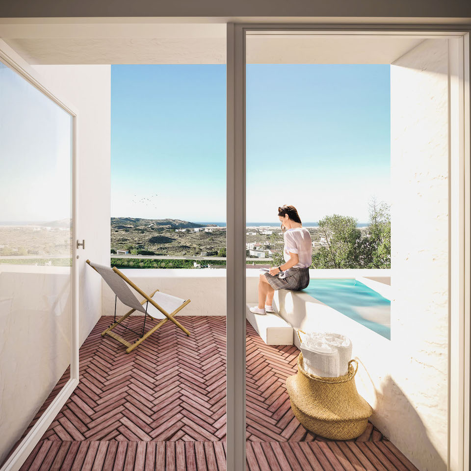 Com projecto de arquitectura assinado pela RMS Arquitetos, em cada casa há um pátio privado virado a poente e um terraço compiscina de imersão aquecida, além de grandes janelas envidraçadas em todas as divisões, que oferecem vistas desafogadas sobre o Atlântico e a aldeia da Carrapateira. A pensar nos trabalhadores remotos e nómadas digitais, está a ser criado um espaço de coworking, ao passo que os surfistas e ciclistas vão apreciar a arrecadação e o estacionamento subterrâneo com pontos de carregamento eléctrico.
