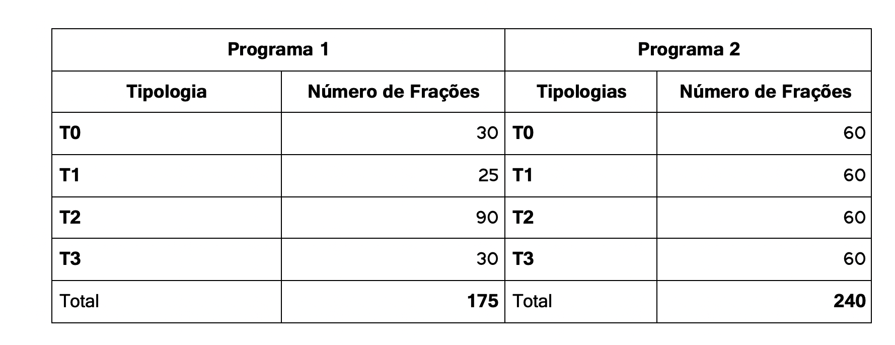 O quadro abaixo resume o Mix de Tipologias do Empreendimento. O número de frações por Tipologia é extremamente discutível porque depende das necessidades de cada localização específica. Por essa razão adoptei um critério de “igualdade”.