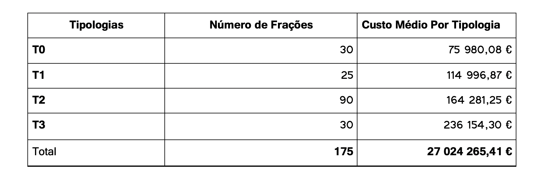 Resumindo, desenvolver um projeto residencial com 175 casas (com varandas) e 205 lugares de estacionamento pode custar cerca de 27 024 265,41 €, excluindo valor de terreno, margem de lucro de promoção/remuneração do capital investido e custos de Marketing e Comercialização.
