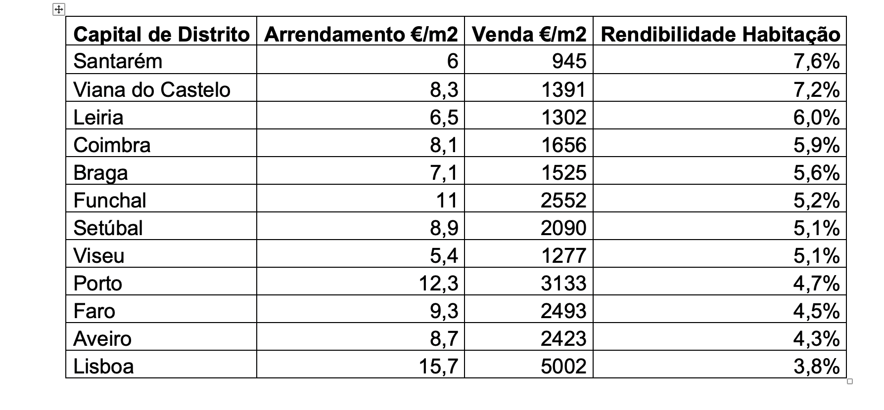 Os dados apresentados no quadro acima demonstram as diferenças entre localizações, que se explica pela maior ou menor liquidez de cada mercado e o seu nível de risco. Quer isto dizer que, “teoricamente”, Lisboa tem mais compradores dispostos a terem uma menor rentabilidade porque preferem ter menos risco. Por esta razão a Yield em Lisboa é inferior ás restantes cidades mencionadas.