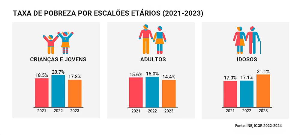 “Em sentido contrário, verificou-se um forte agravamento da taxa de pobreza dos idosos, que subiu quatro pontos percentuais passando de 17,1% em 2022 para 21,1% em 2023. Este facto não deixa de ser extremamente preocupante, mesmo que, como salienta o INE, possa ser explicado pelas alterações na metodologia de cálculo das pensões de velhice no ICOR 2024”.