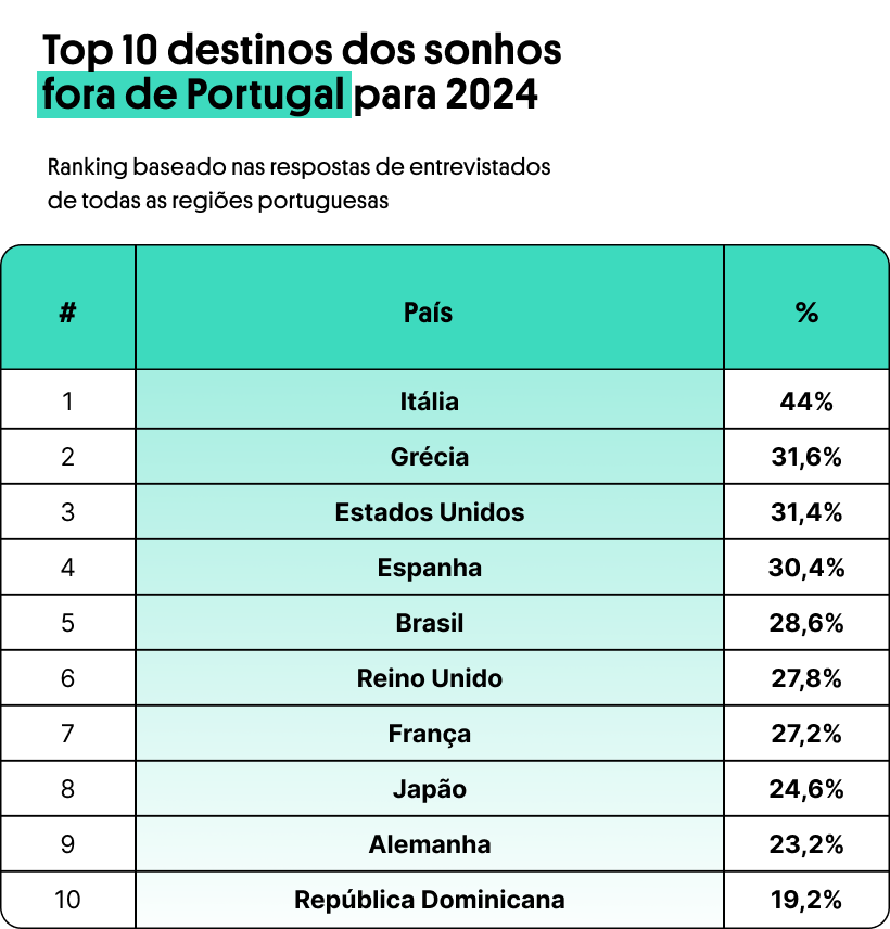 - Já internacionalmente, os países "queridinhos" para uma viagem são a Itália (44%), Grécia (31,6%) e Estados Unidos (31,4%);