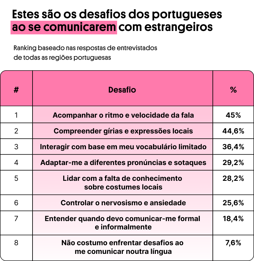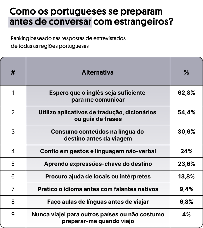 Com isso em mente, enquanto uma plataforma de idiomas, uma das curiosidades desvendadas na pesquisa da Preply girou em torno de como a população de Portugal costuma se virar durante suas interações em diferentes línguas, principalmente no que diz respeito aos possíveis desafios envolvendo a barreira linguística.