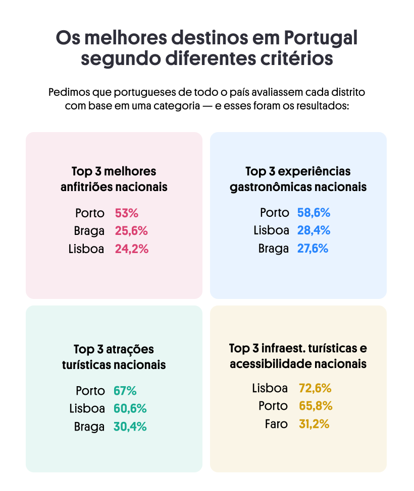 De acordo com os entrevistados, por exemplo, Lisboa (top 1 em infraestrutura e acessibilidade) é a segunda região que melhor se garante em relação às atracções turísticas (60,6%) e gastronomia (28,4%), ao passo que Braga (25,6%) possuiria os segundo melhores anfitriões de Portugal.