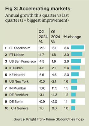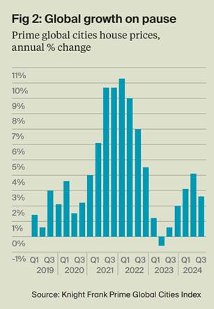 Segundo o Prime Global Cities Index, os mercados imobiliários mundiais registaram um declínio acentuado do crescimento no final de 2022 e no início de 2023, com a subida das taxas de juro a aumentar os custos das hipotecas. Com o crescimento dos lucros a superar os preços da habitação e com a oferta de stock para venda na maioria dos mercados de primeira linha a ficar aquém da procura, os preços começaram a subir novamente a partir de meados de 2023.
