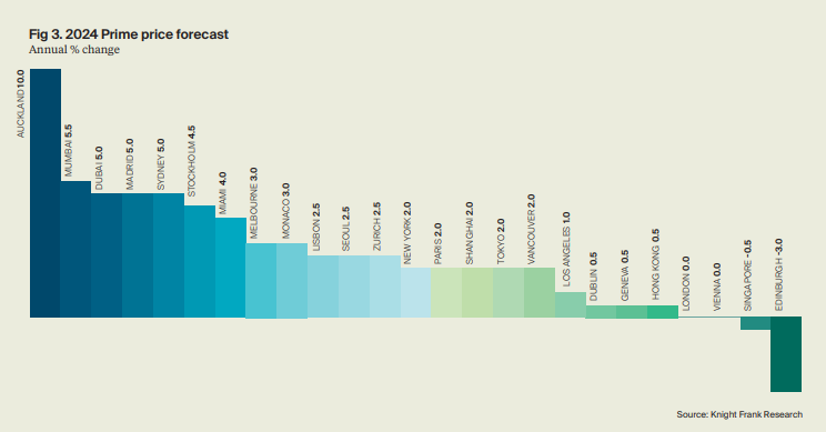 Se, por um lado, o Dubai é líder nas previsões de preços para 2023, por outro, Auckland está no topo em 2024, com um aumento de 10% dos preços de luxo. Considerando as 25 cidades monitorizadas, o Dubai surge na terceira posição, com um crescimento de 5%, sendo que Madrid (5%) e Estocolmo (4,5%) são as cidades europeias com as melhores projeções. Lisboa encontra-se no top 10, ocupando a décima posição com uma previsão de crescimento de 2,5%.