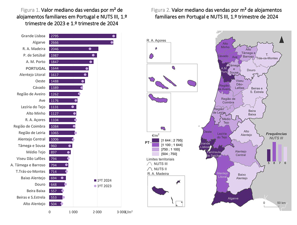 No 1.º trimestre de 2024, o preço mediano de alojamentos familiares em Portugal foi 1 644 €/m2, representando um acréscimo de 1,5% em relação ao 4.º trimestre de 2023 e correspondendo a uma taxa de variação homóloga de 5,0% (7,9% no trimestre anterior). Em 19 das 26 sub-regiões NUTS III em que se divide o país, o preço mediano da habitação aumentou em relação ao período homólogo de 2023, destacandose o Baixo Alentejo com o maior crescimento (28,5%).