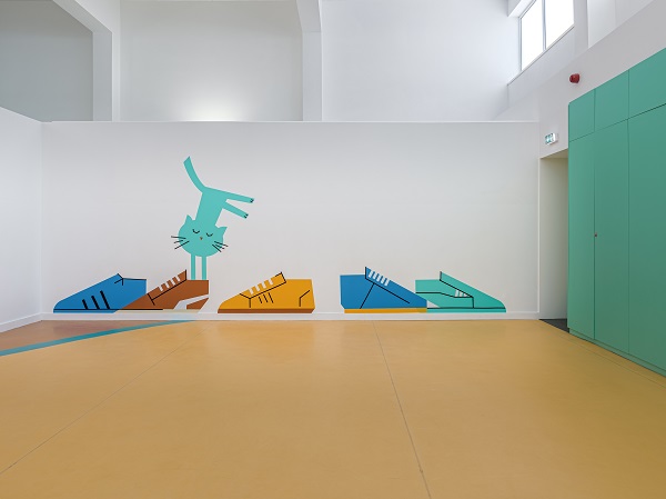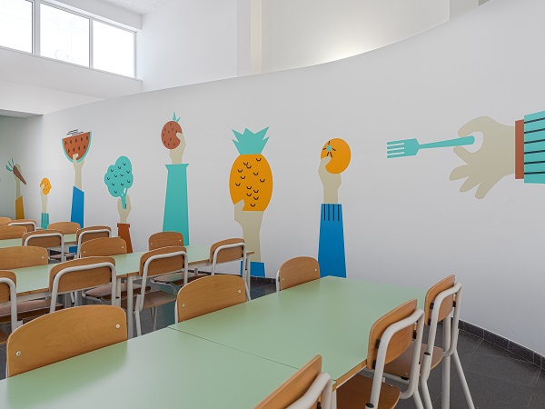 No edifício de dois pisos, existe também uma sala para refeições, uma sala para desporto e uma biblioteca com 3 funções distintas. Sempre conectados com o espaço exterior envolvente através de grandes janelas, os vários espaços têm também forte ligação à natureza através das madeiras usadas no mobiliário e da cortiça que reveste paredes e convida à exposição dos trabalhos dos alunos.