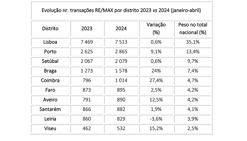 Numa análise por distrito e apenas considerando aqueles que registaram mais de 200 transacções, o distrito de Lisboa representou mais de um terço das transacções da RE/MAX (35,1%) nos primeiros quatro meses do ano, o que demonstra bem o enorme peso que representa na rede. Em destaque estiveram também os distritos de Coimbra e Braga, com crescimentos acima dos 20%, concretamente 27,4% e 24%, respectivamente. Já Viseu cresceu 15,2% no número de transacções face a igual período de 2023 e o Porto foi o distrito que consolidou a segunda posição nacional com quase 2.900 transacções.