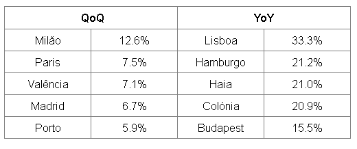 No contexto europeu, as cidades espanholas e italianas apresentam uma tendência semelhante, com Milão a registar o maior aumento trimestral de quartos em toda a Europa (12,6%). As cidades espanholas de Valência e Madrid registaram um aumento trimestral de 7,1% e 6,7%, respetivamente. Mostrando uma tendência diferente, embora quase todas as cidades holandesas e alemãs no Índice estejam entre as cidades com preços mais elevados na Europa, estas cidades apresentam aumentos trimestrais menos acentuados.