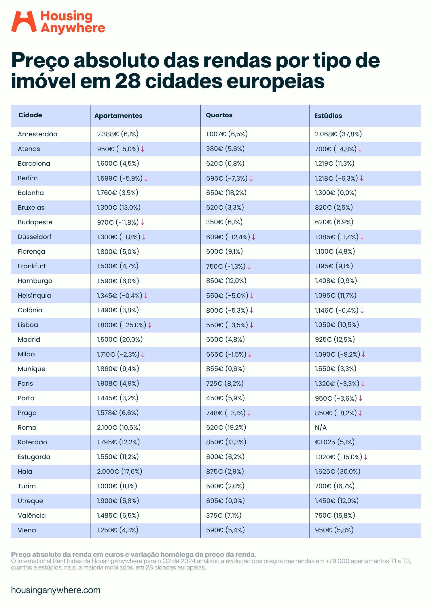A nível europeu, os aumentos distribuem-se pelos três tipos de imóveis analisados: os quartos aumentam 3,5% em relação ao ano anterior, os apartamentos 4,2% e os estúdios 5,4%.