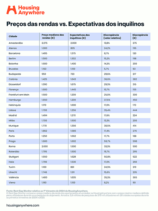 O Rent Gap Monitor da HousingAnywhere compara o preço mediano dos apartamentos (maioritariamente mobilados) listados na plataforma com o preço máximo mediano definido pelos utilizadores quando procuram um apartamento para arrendar no site. O relatório analisou mais de 3,9 milhões de pesquisas em 28 cidades europeias de 12 países nos primeiros trimestres de 2024 e 2023.