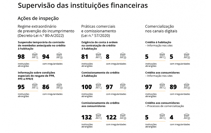 Soma-se ainda a fiscalização da cobrança de juros moratórios e outros encargos associados ao incumprimento de cartões e linhas de crédito, junto de três instituições, e a cobrança de juros em facilidades de descoberto e ultrapassagens de crédito.