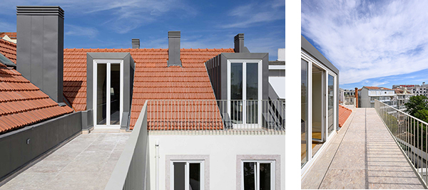 Foram recuperadas ainda as gateiras de topo curvo localizadas na cobertura. Para além destes elementos, foi possível recuperar outros elementos existentes, que remetiam para um universo predial lisboeta do início do séc. XX e que se pretendeu dar nova vida. É o caso das varandas e do passadiço de estrutura metálica localizados no tardoz. Procurou-se, assim, a partir dos poucos elementos recuperáveis ou reutilizáveis reinventar o edifício conferindo-lhe uma nova unidade que garante uma leitura unitária no espaço e no tempo.