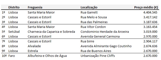 A completar o pódio deste ranking de luxo encontram-se a Rua Melo e Sousa, no Estoril, com um preço médio de 3.417.142 euros, e a Rua das Palmeiras, na Quinta da Marinha, em Cascais (3.187.636 euros).