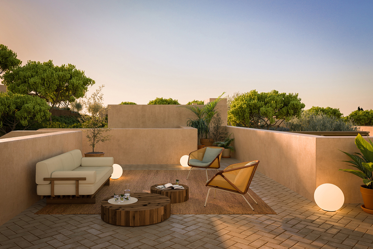 Implantadas em lotes individuais que podem chegar aos 11 400 m², as moradias contam com áreas entre os 237 m² e 438 m² e tipologias que vão do T2 ao T5. Em cada casa há uma piscina privativa, jardim e terraços na cobertura que proporcionam vistas panorâmicas sobre a envolvente natural.