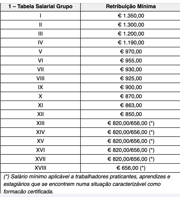 Tanto os novos valores da tabela salarial (que abaixo se reproduz), como o subsídio de refeição, no valor diário de 7,50 euros, acordados, produzem efeitos a 1 de janeiro de 2024.
