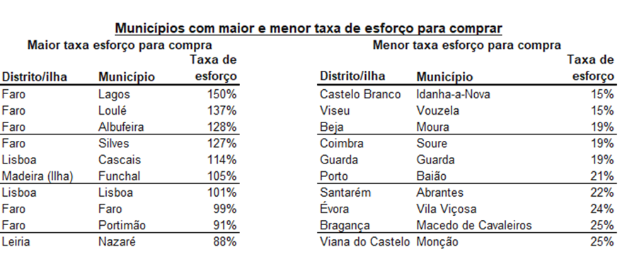 Lagos, no Algarve, é a cidade onde a taxa de esforço das famílias para adquirir uma casa é mais elevada, atingindo 150% dos rendimentos médios familiares no município. A seguir estão Loulé (137%), Albufeira (128%), Silves (127%), Cascais (114%), Funchal (105%) e Lisboa (101%). Com taxas de esforço abaixo dos 100% encontram-se Faro (99%), Portimão (91%) e Nazaré (88%).