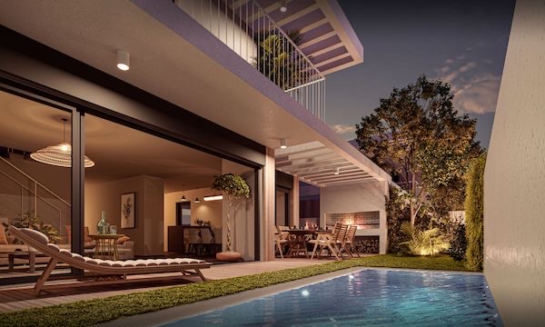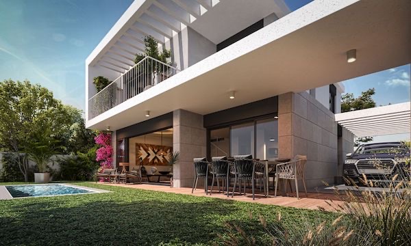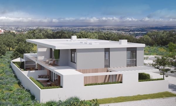 As moradias, de tipologias T4, geminadas ou isoladas, têm todas piscina e jardim privativo.