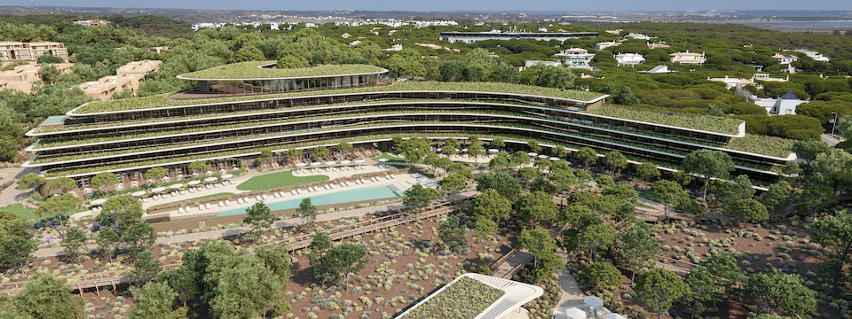 O hotel com 197 quartos, onde se incluem seis suites isoladas no meio do pinhal (Forest Suites), terá a assinatura do Marriott e uma forte componente de sustentabilidade, quer ao nível arquitectónico e de construção, quer de energia, abastecimento de água e na futura operação turística.