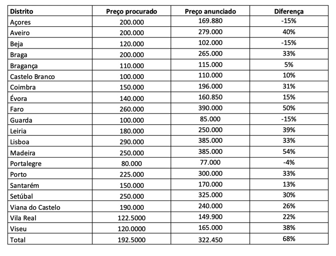 Faro (50%), Viseu (38%), Aveiro (40%) e Leiria (39%) são os distritos com maior discrepância entre os preços anunciados no mercado e os valores procurados pelos utilizadores e são, actualmente, a principal razão para que exista uma diferença nacional tão grande entre a procura e a oferta. Em Faro procuram por 260 000 euros e custam, em média, 390 000 euros, em Aveiro procuram por 200 000 euros e a oferta está em 279 000 euros e em Leiria, procuram por 180 000 euros e na realidade custa, em média, 250 000 euros.