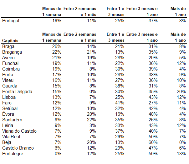 Analisando as “vendas expresso” - ou seja, imóveis residenciais que se vendem em menos de uma semana, tendo em conta o tempo de permanência dos anúncios - por capitais de distrito, é em Braga que encontramos uma maior percentagem, 26% das casas são vendidas nesse período. Seguem-se Bragança (22%), Aveiro (21%), Funchal (19%) e Coimbra (19%). Abaixo da média nacional, encontram-se o Porto (17%), Viseu (16%), Guarda (15%), Ponta Delgada (15%), Lisboa (13%), Faro (12%), Setúbal (12%), Évora (12%), Santarém (9%) e Leira (9%).