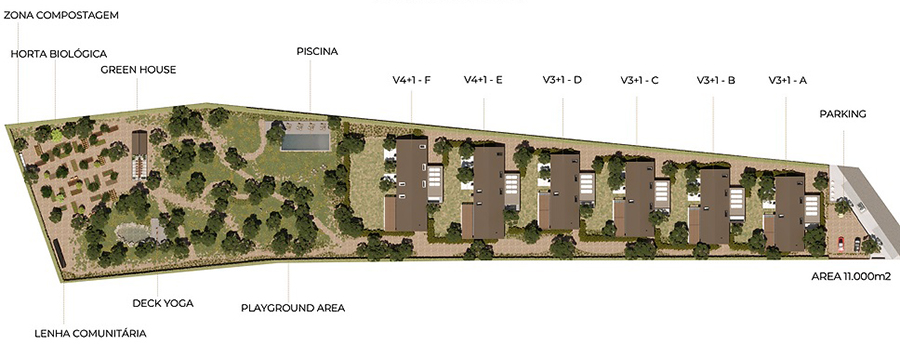 Cabe ainda na zona de lazer uma grande mancha verde com sombra com mais de 1000m2, para crianças e adultos socializarem.