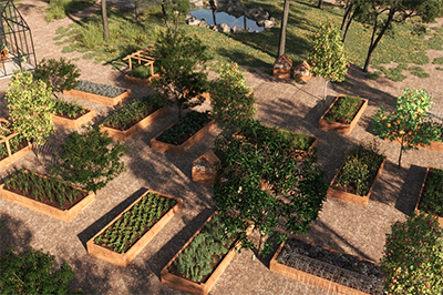Nesta zona de Lazer irá existir uma horta biológica com 1000m2 construída com o princípio da permacultura para auto-consumo. Uma zona de animais de capoeira, uma zona de compostagem, e ainda uma zona de lenha comunitária.