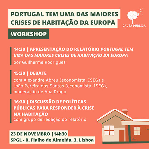 A Causa Pública tem vindo a trabalhar sobre a questão da habitação, sob a coordenação de Guilherme Rodrigues. No dia 23 de novembro, por ocasião do workshop, serão apresentados o primeiro de um conjunto de três relatórios dedicados a este tema. “Pretende-se apresentar o diagnóstico da crise habitacional portuguesa, discutir os seus custos sociais, mas também o seu impacto económico – que é muito relevante e que tende geralmente a ser ignorado no debate público. Finalmente, depois de anos em que foram lançados diferentes pacotes legislativos, queremos começar a debater políticas públicas que respondam efectivamente ao problema” - afirma aquela associação na convocatória.