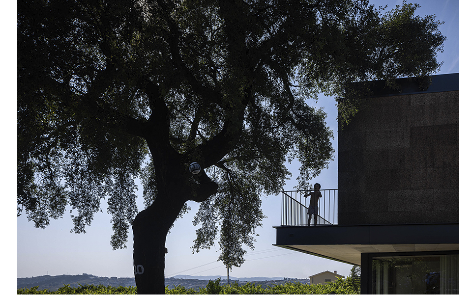 A casa, projectada pelo atelier Skemba de Amarante, coexiste com o grande sobreiro e respeita a sua presença, dando-lhe o devido destaque e relevância sem prejudicar a função e o usufruto do espaço exterior envolvente.