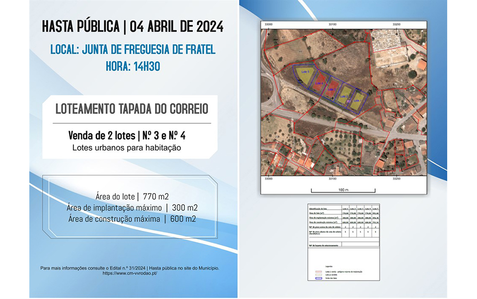 A Câmara Municipal de Vila Velha de Ródão, no distrito de Castelo Branco, vai colocar em venda dois lotes na Freguesia de Fratel, destinados a habitação própria e permanente.