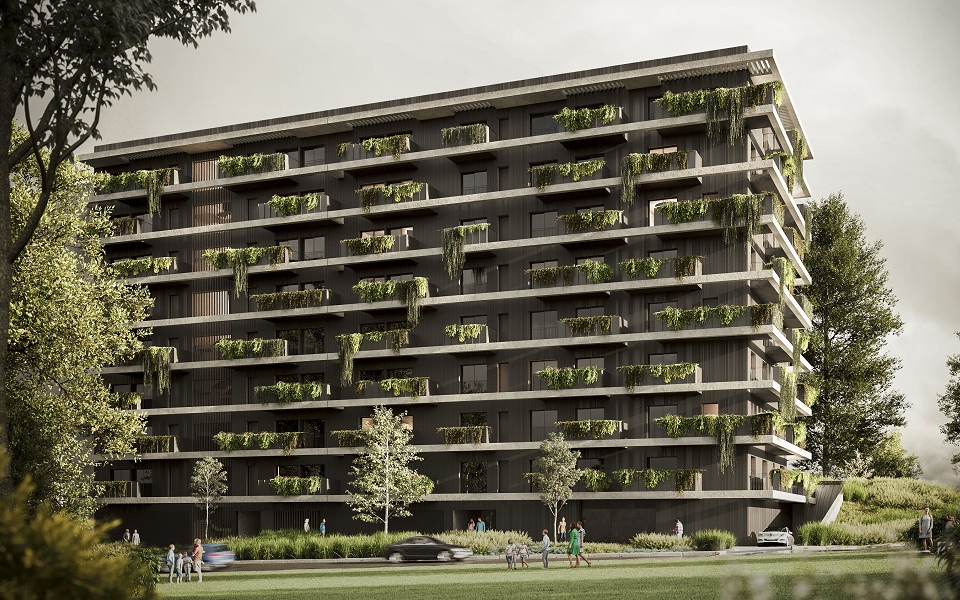 O novo edifício habitacional com 56 apartamentos que começou a ser construído em Vila Nova de Famalicão, irá destacar-se pela verticalização de plantas na fachada, com floreiras em todas as varandas.