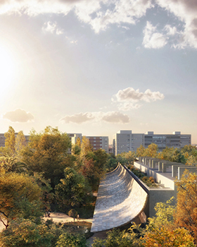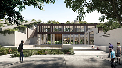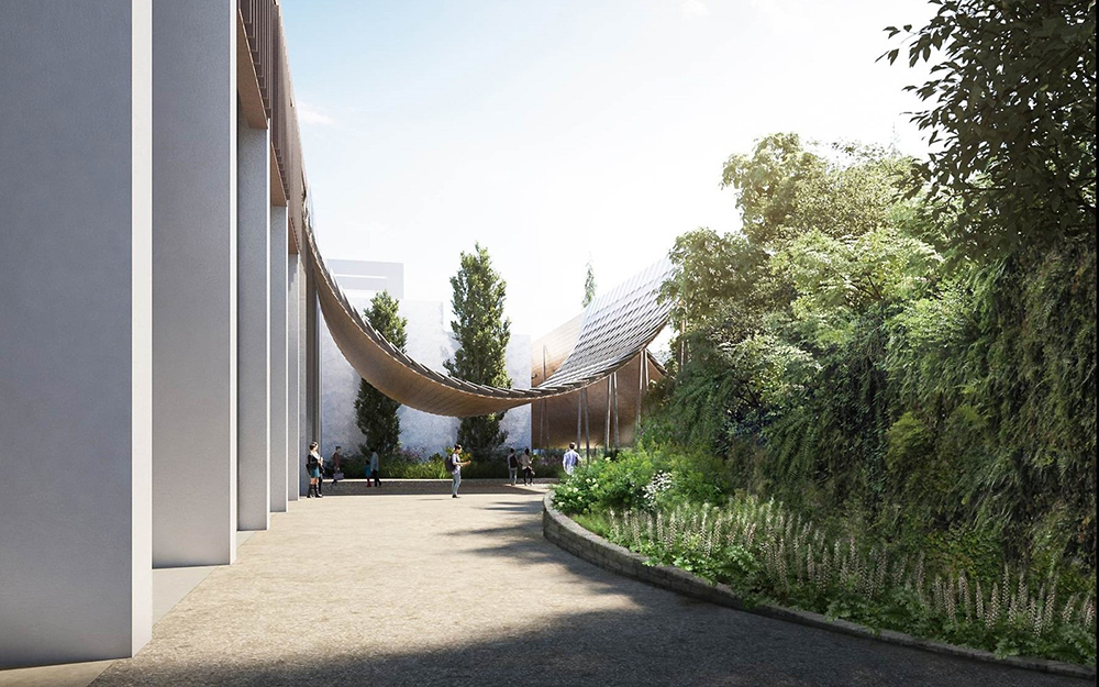 Kengo Kuma reimaginou completamente o anterior edifício de betão, da autoria do arquitecto britânico Leslie Martin, aumentando a sua transparência para sul e acrescentando-lhe uma pala de 100 metros de comprimento, com uma cobertura de grandes telhas de cerâmica brancas.