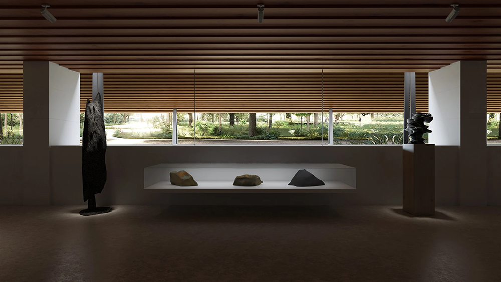 O átrio transparente liga visualmente o novo jardim ao resto do espaço da Gulbenkian e uma nova galeria de mil metros quadrados acolherá exposições da colecção do CAM, estando ladeada por uma Sala de Desenho dedicada à apresentação da sua extensa colecção de obras sobre papel.