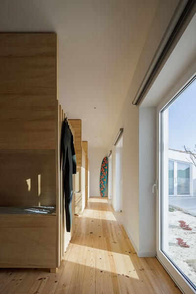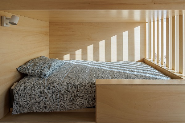 O desenho dos beliches também foi um grande desafio, já que se tratava de incorporar oito camas, em 33m2, estes foram cuidadosamente desenhados em madeira e desenvolvidos de forma a que obtivessem privacidade, estética e funcionalidade.