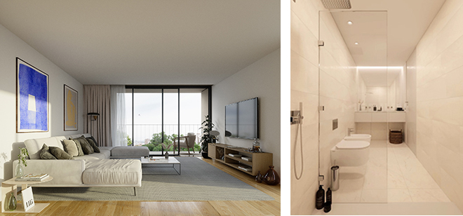 Os 13 apartamentos são de tipologias T2 e T3 e possuem áreas entre 88,2 metros quadrados e 134,30 metros quadrados. Os dois espaços comerciais são duas lojas com 31,8 metros quadrados e 54 metros quadrados. Os preços dos apartamentos variam entre os 300.000 e os 350.000 euros, enaunato as lojas estão a ser comercializadas por 90.000 e 140.000 euros.
