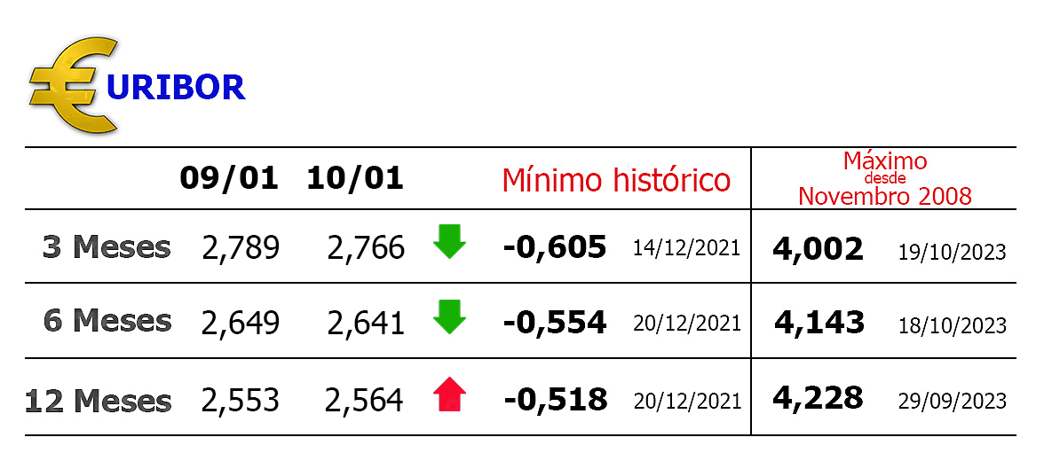 A média da Euribor em Dezembro desceu 0,182 pontos para 2,825% a três meses (contra 3,007% em Novembro), 0,156 pontos para 2,632% a seis meses (contra 2,788%) e 0,070 pontos para 2,436% a 12 meses (contra 2,506%).