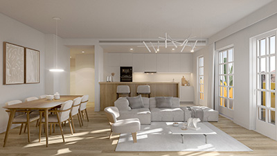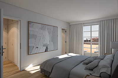 A solução arquitectónica do projeto passa pela harmoniosa coexistência entre a reabilitação das históricas fachadas do edificado pre-existente e a modernidade contemporânea bem patentes no design dos interiores dos apartamentos.