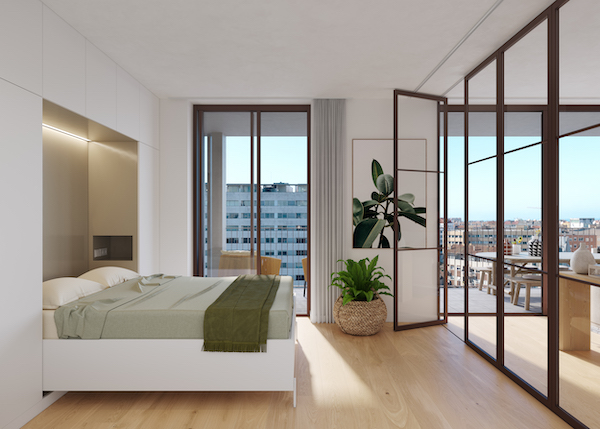 Dentro dos apartamentos KORI estão previstas áreas que proporcionam quatro vivências distintas: sala de jantar, quarto, zona social ou espaço de trabalho. As soluções que permitem a flexibilidade do uso destas áreas, assim como todos os detalhes, foram previstos para experienciar uma área maior do que a área da planta: as janelas a toda a altura, os materiais com cores claras e uma varanda que, para além de estar equipada com bancada, lava-loiças e uma horta para produtos biológicos, está totalmente integrada com a área interior, revelando-se como área privativa do apartamento.