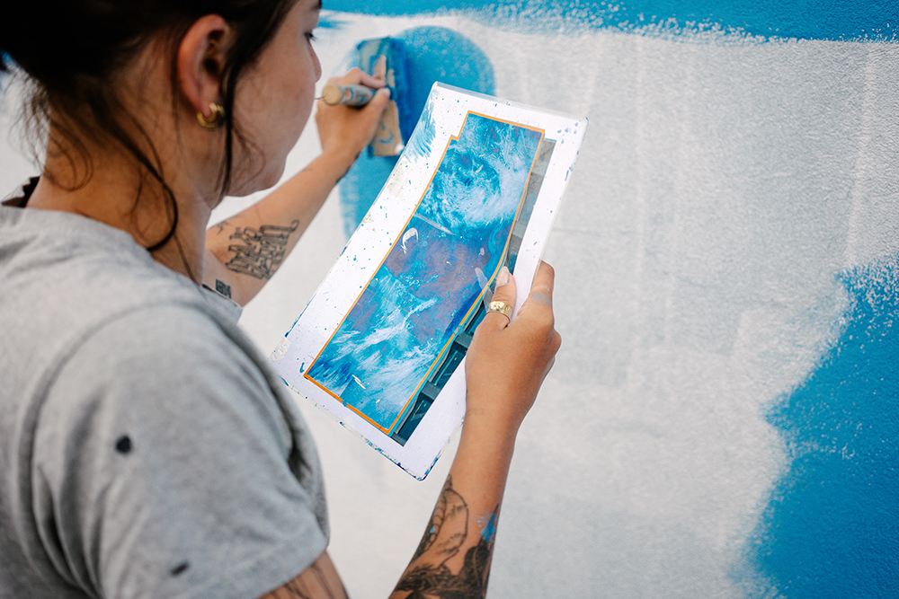O novo mural da artista belga na fachada da residência de estudantes Livensa Living Lisboa Cidade representa duas silhuetas humanas integradas na paisagem, a partir de dois elementos - a água e a pedra - que pretendem celebrar a conexão das regiões através da arte e da cultura. A água representa os intercâmbios entre as regiões de Valónia-Bruxelas e Lisboa, enquanto a pedra simboliza a força e a estabilidade própria de cada cultura.