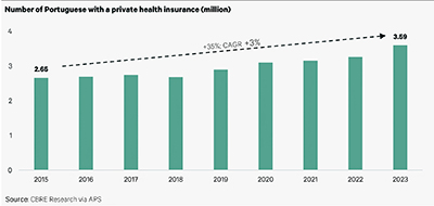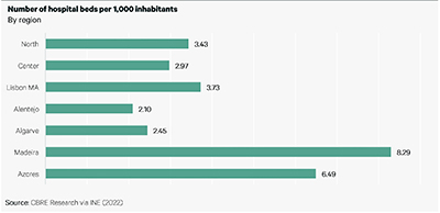 José Moutinho, responsável pela área de research na CBRE Portugal refere que "a falta de camas no serviço nacional de saúde é bastante severa, particularmente nos distritos de Lisboa e Porto. Em 2023 existiam mais de 1.800 pessoas a aguardar por uma cama em cuidados continuados e é previsível que este número venha a aumentar, o que obrigará também a um incremento significativo na oferta".