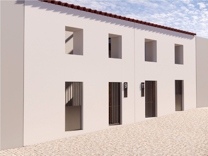 O interior dos edifícios corresponderá a uma construção nova, de tipologia T3, que contempla a inserção de um pátio descoberto na entrada. No piso à cota de entrada, localizam-se as áreas funcionais e sociais – sala de estar, cozinha e sala de jantar –, um quarto, uma instalação sanitária acessível a pessoas com mobilidade reduzida, uma zona técnica e um logradouro; enquanto no primeiro andar se situam dois quartos, com as respectivas instalações sanitárias, e um terraço.