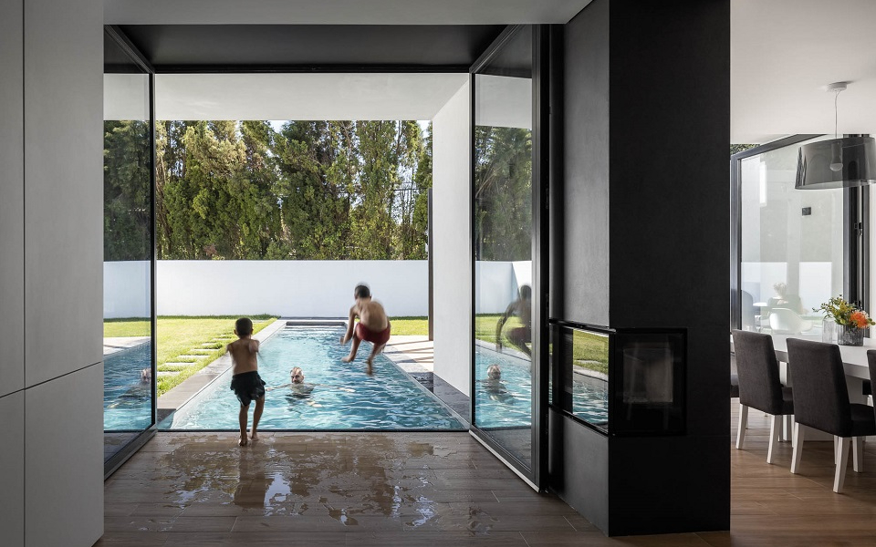 A Casa Diagonal, localizada em Aveiro, tem uma piscina onde pode entrar a partir da sala de estar. Um projecto do atelier Frari – architecture network.